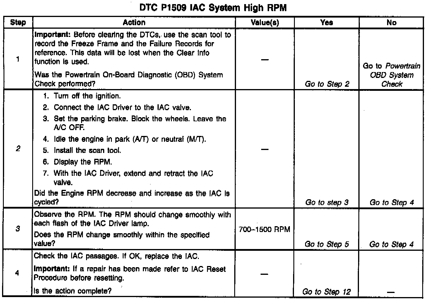 3. This step checks the quality of the IAC movement in Step 2. Between 700 RPM and about 1200 RPM, the engine speed should change smoothly with each flash of the tester lamp in both extend and retract. If the IAC valve is retracted beyond the control range (about 1500 RPM), it may take many flashes in the extend position before engine speed will begin to drop. This is normal on certain engines, fully extending IAC may cause engine stall. This may be normal.