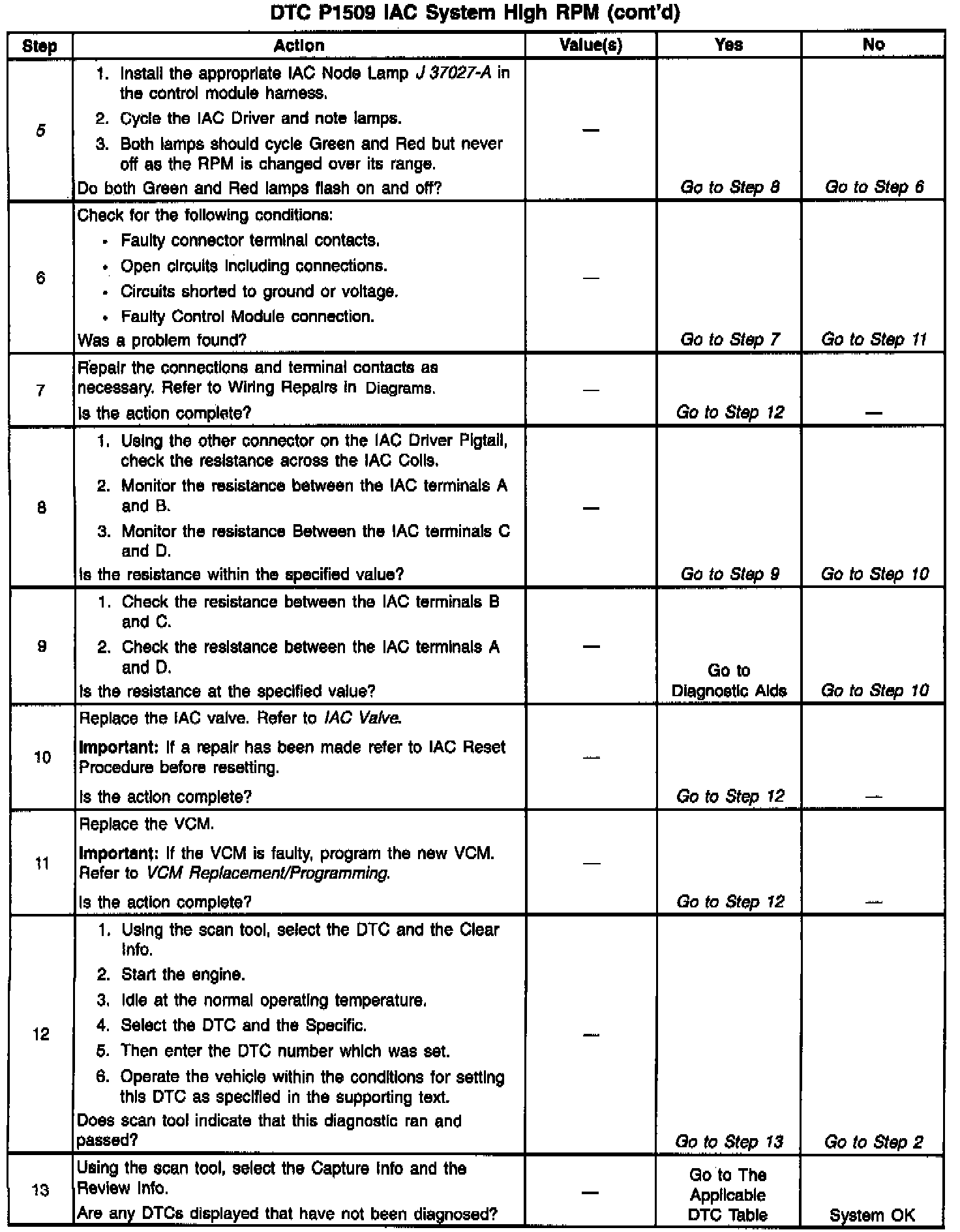 5. Steps 2 and 3 verified proper IAC valve operation while this Step checks the IAC circuits. Each lamp on the node lamp should flash red and green while the IAC valve is cycled. While the sequence of color is not important it either lamp is OFF or does not flash red and green, check the circuits for faults beginning with poor terminal contacts.