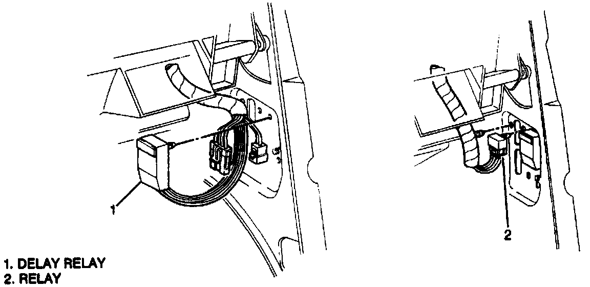 1. Power door lock delay relay and/or power relay to cowl side panel by snapping barbed connector into place.
