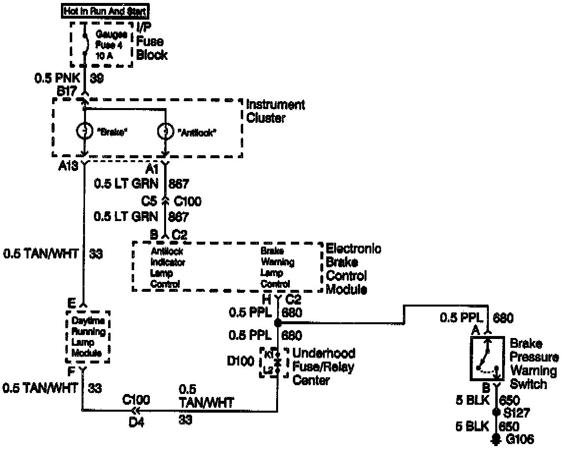 The Electronic Brake Control Module (EBCM) controls the ANTILOCK indicator lamp by supplying ground to turn the lamp on or 12 volts to turn the lamp off.