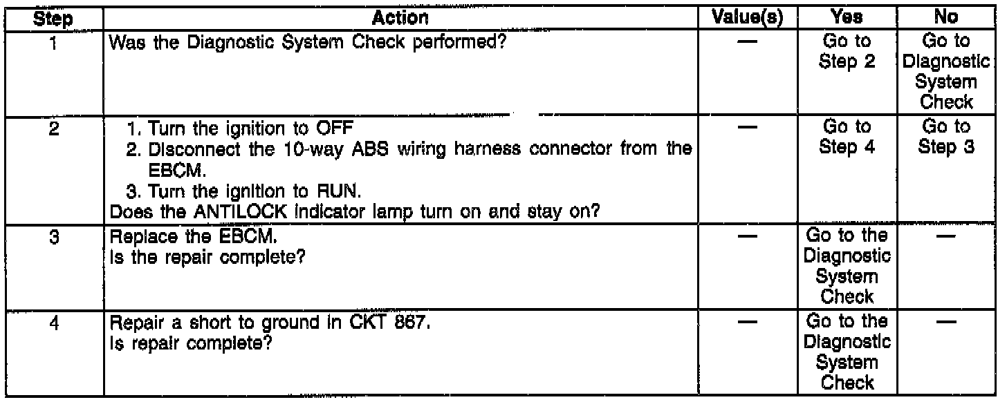 If the ANTILOCK indicator lamp is on constantly, the Electronic Brake Control Module (EBCM) is not capable of turning the lamp off or there is a short to ground in the circuit.