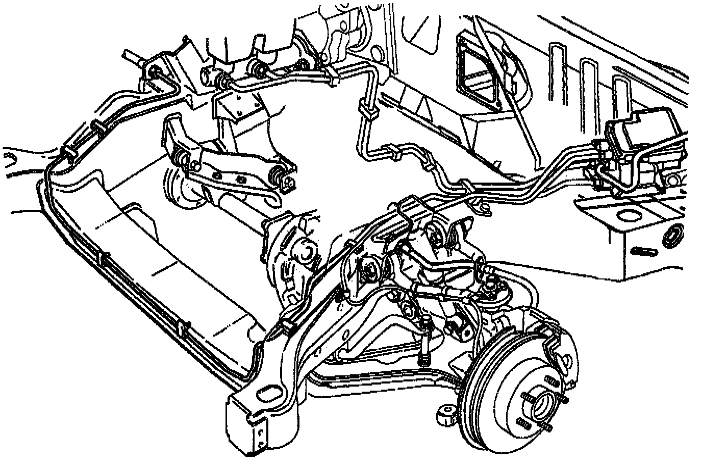 FRONT BRAKE PIPE REPLACEMENTCAUTION: Always use doubled walled steel brake pipe when replacing brake pipes. The use of any other pipe is not recommended and may cause brake system failure. Carefully route and retain replacement brake pipes. Always use the correct fasteners and original location for replacement brake pipes. Failure to properly route and retain brake pipes may cause damage to the brake pipes and brake system failure. Brake pipes that run parallel to each other must maintain a 6 mm(1/4 inch) clearance.
