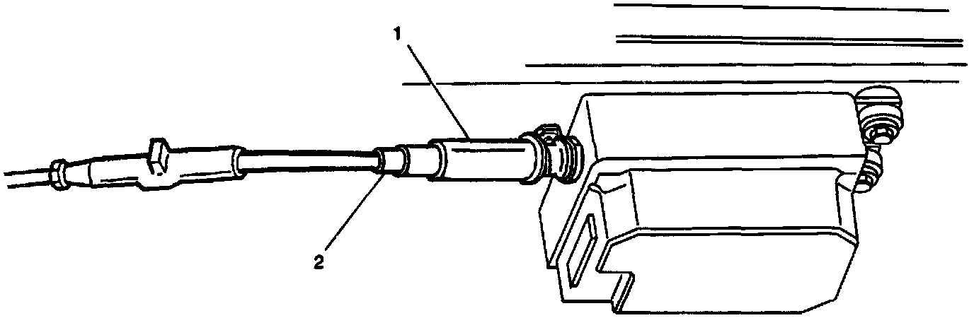 6. If a new cable is being installed, pull the cruise control cable ferrule (2) through the opposite end of the fitting (1). The ferrule (2) colour is natural and must be visible when pulled through the fitting (1).
