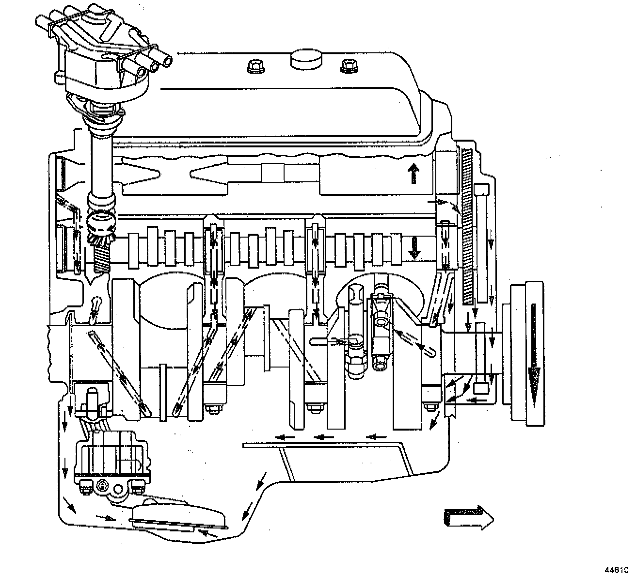 ^ Filtered oil flows into the main gallery and then to the camshaft, the balance shaft, the rear bearing, and the crankshaft bearings.