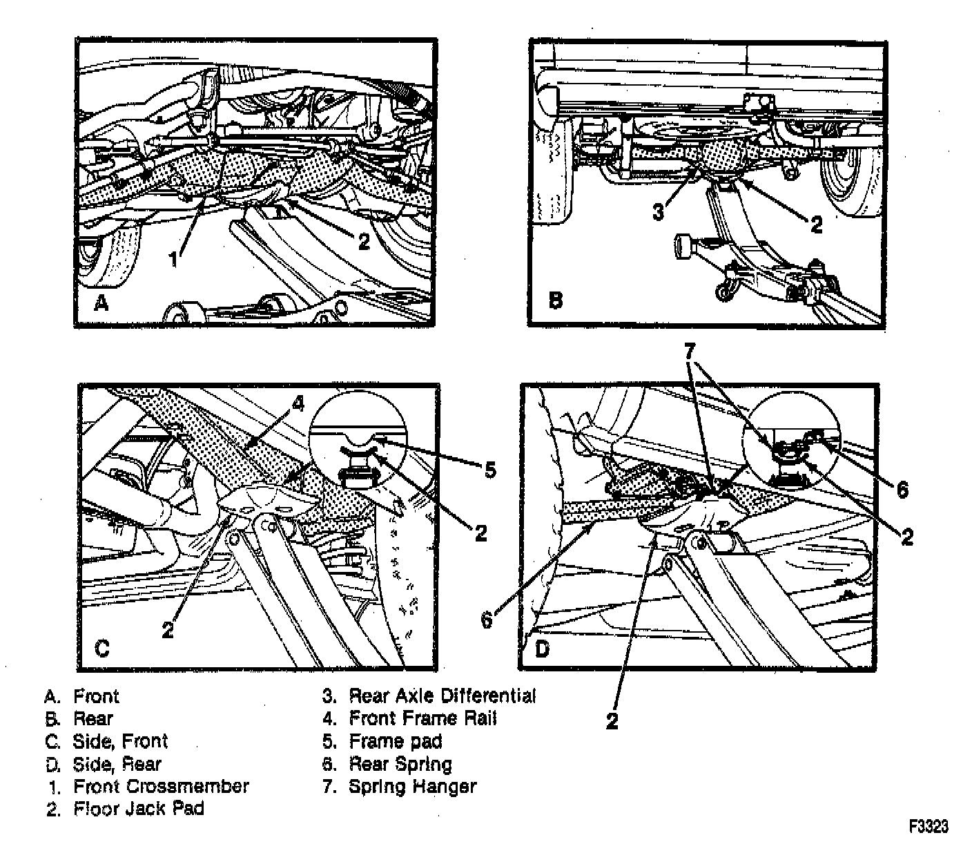 GENERAL VEHICLE LIFTING AND JACKINGFor lifting the vehicle various lift points are recommended. The floor jack lift points on the front are the center of the front suspension crossmember or the front frame lift pad. The floor jack lift points on the rear are the rear axle differential or the rear spring hanger. The one-column hoist lift points for the front end are the front frame between the lower control arm and the frame pad or the front frame pad when using a tip-up hoist pad. The one-column hoist lift point for the rear end is the rear spring, just behind the hanger for the tip-up pad only. The suspension-contact hoist lift points for the front end are the outer areas of the lower control arms.