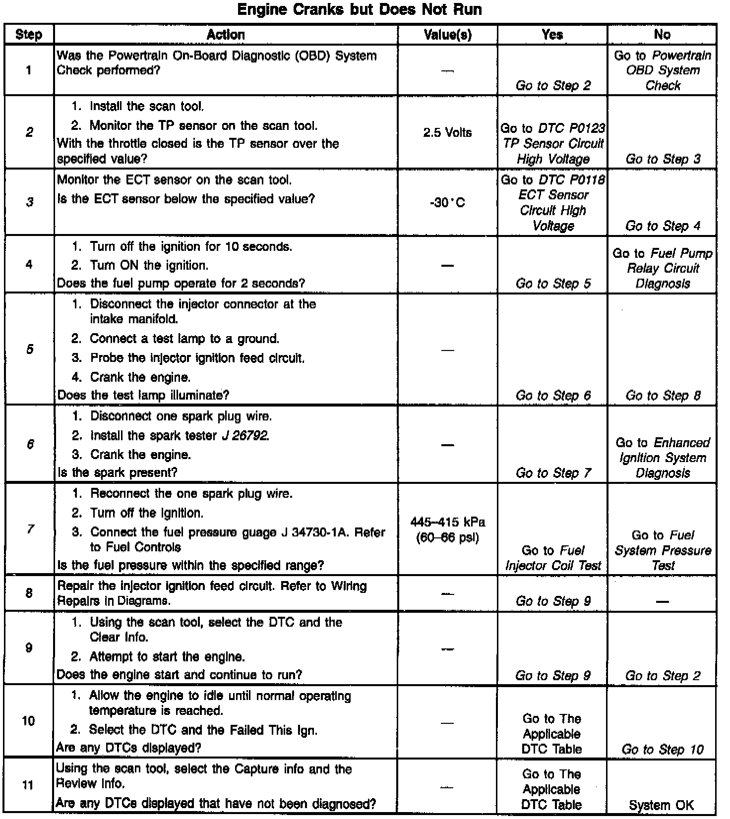 This table assumes that the battery condition and engine cranking speed are OK, and there is adequate fuel in the tank.