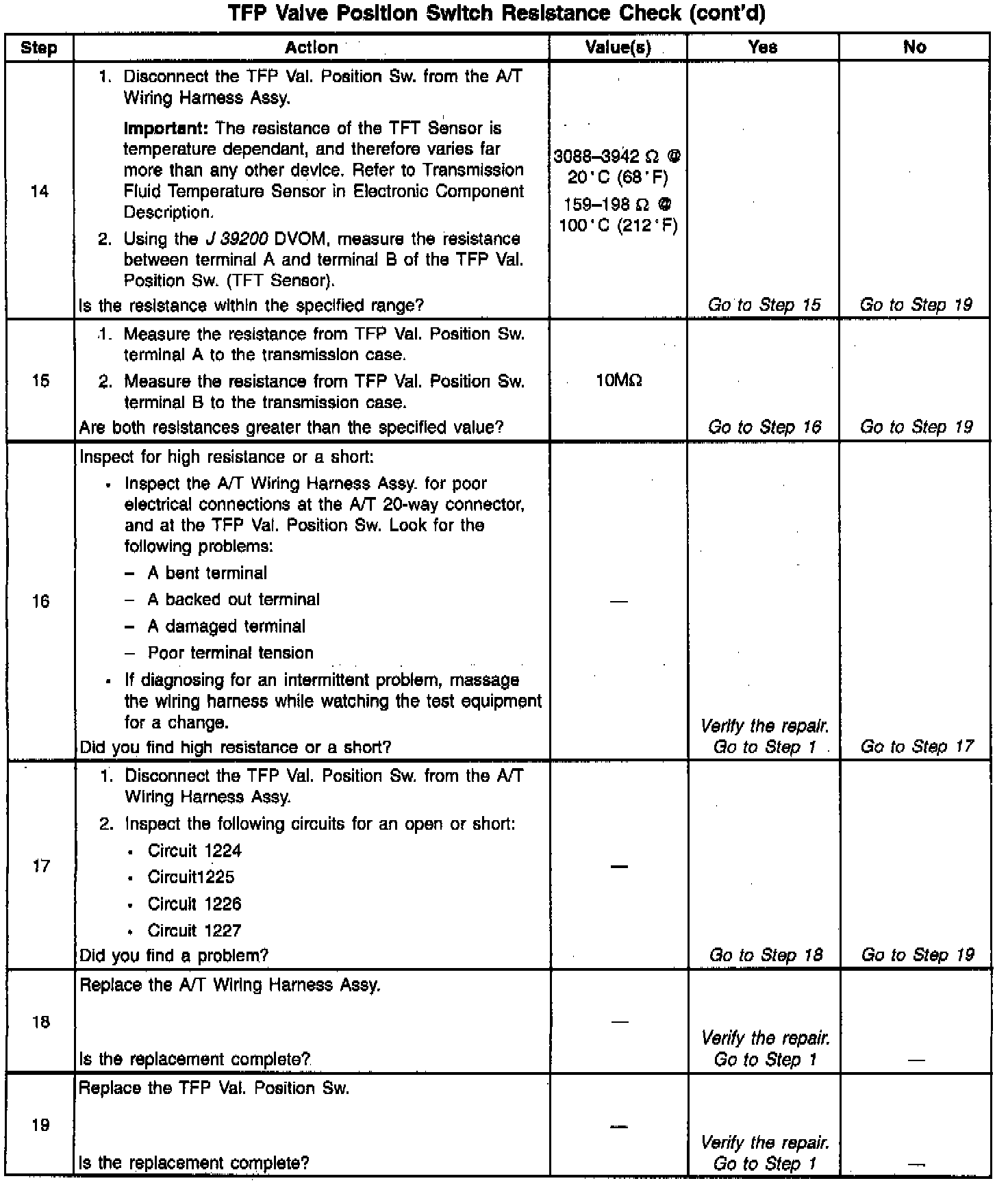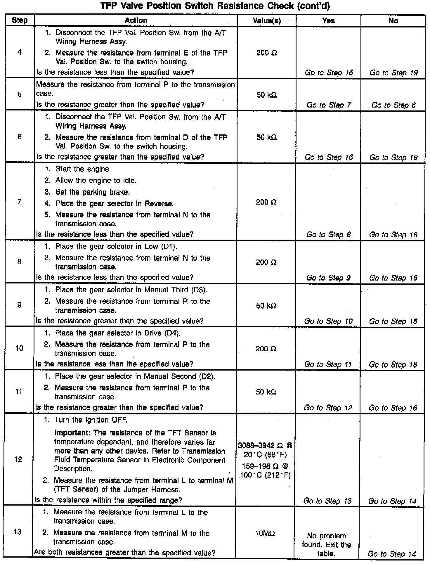 Important: This procedure tests the Automatic Transmission Fluid Pressure Manual Valve Position Switch (TFP Val. Position Sw.) circuits and the Automatic Transmission Fluid Temperature (TFT) Sensor circuit. Do not use this procedure to test other Automatic Transmission circuits, refer to 4L60-E Automatic Transmission Internal Wiring Harness check. Testing and Inspection
