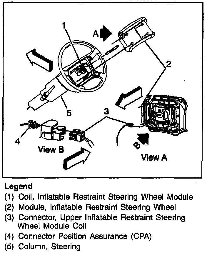 There is a shorting bar on the yellow 2-way connector near the base of the steering column that connects the inflatable restraint steering wheel module coil to the SIR wiring harness. The shorting bar shorts the circuits to the inflatable restraint steering wheel module coil and inflatable restraint steering wheel module during the disconnection of the yellow 2-way connector. The shorting of the inflatable restraint steering wheel module coil and inflatable restraint steering wheel module circuitry will help prevent unwanted deployment of the air bag when servicing the steering column or other SIR system components.