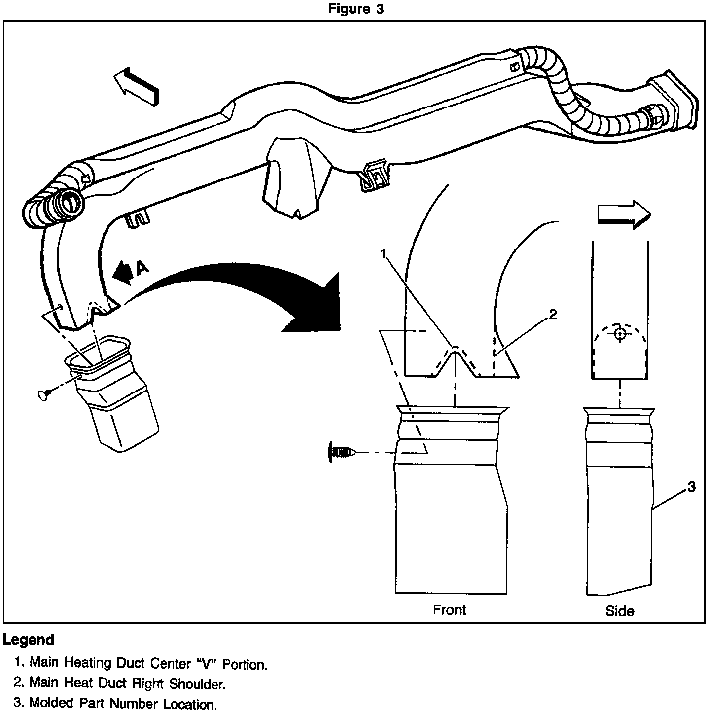 The molded part number on the duct extension must face the front of the vehicle (Figure 3, A). Drill the hole in the duct extension on the left hand side with the part number facing toward the front of the vehicle.