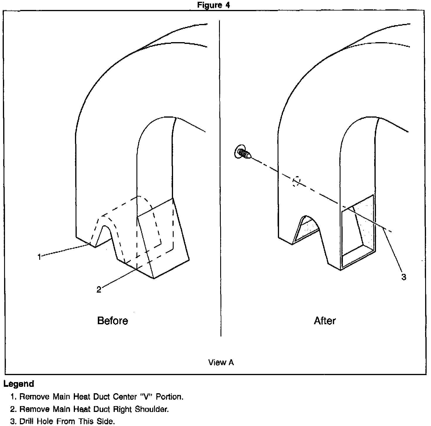 4. With the shoulder portion of the duct removed, drill a 9/32 inch hole in the left side of the duct, 1.25 inches up from the bottom of the duct (Figure 4). The removed portion of the duct opening allows the drill to be positioned so the hole can be made going through the duct from right to left.