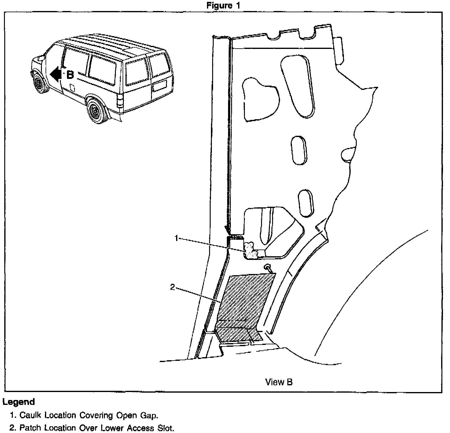 5. Apply thumb grade strip-caulk, 3M part # 08578 or equivalent, over the lower open gap facing rearward inside the upper access slot (Figure 1, # 1).