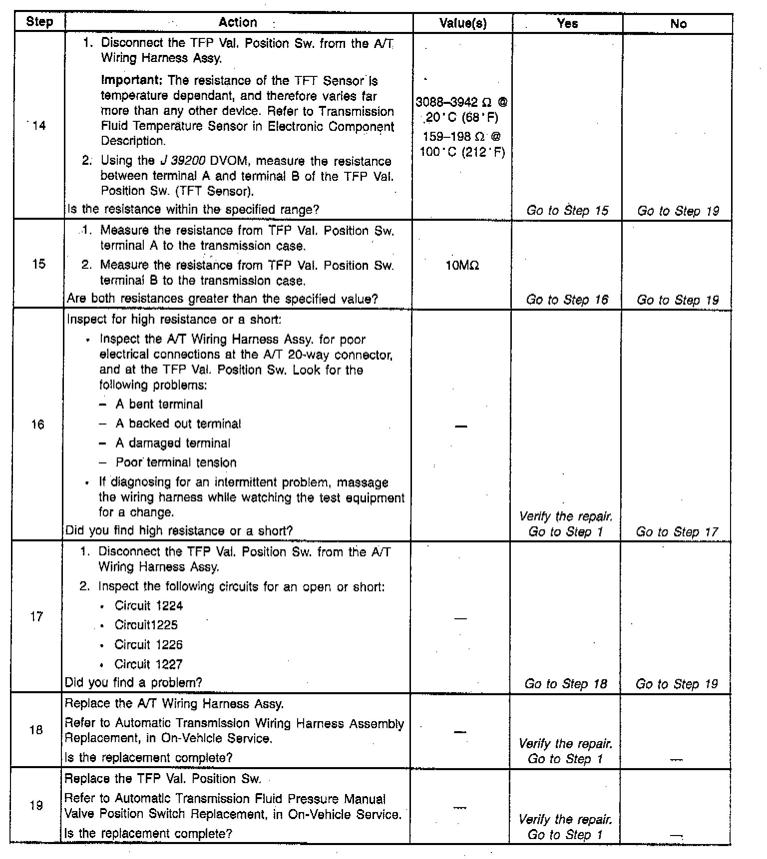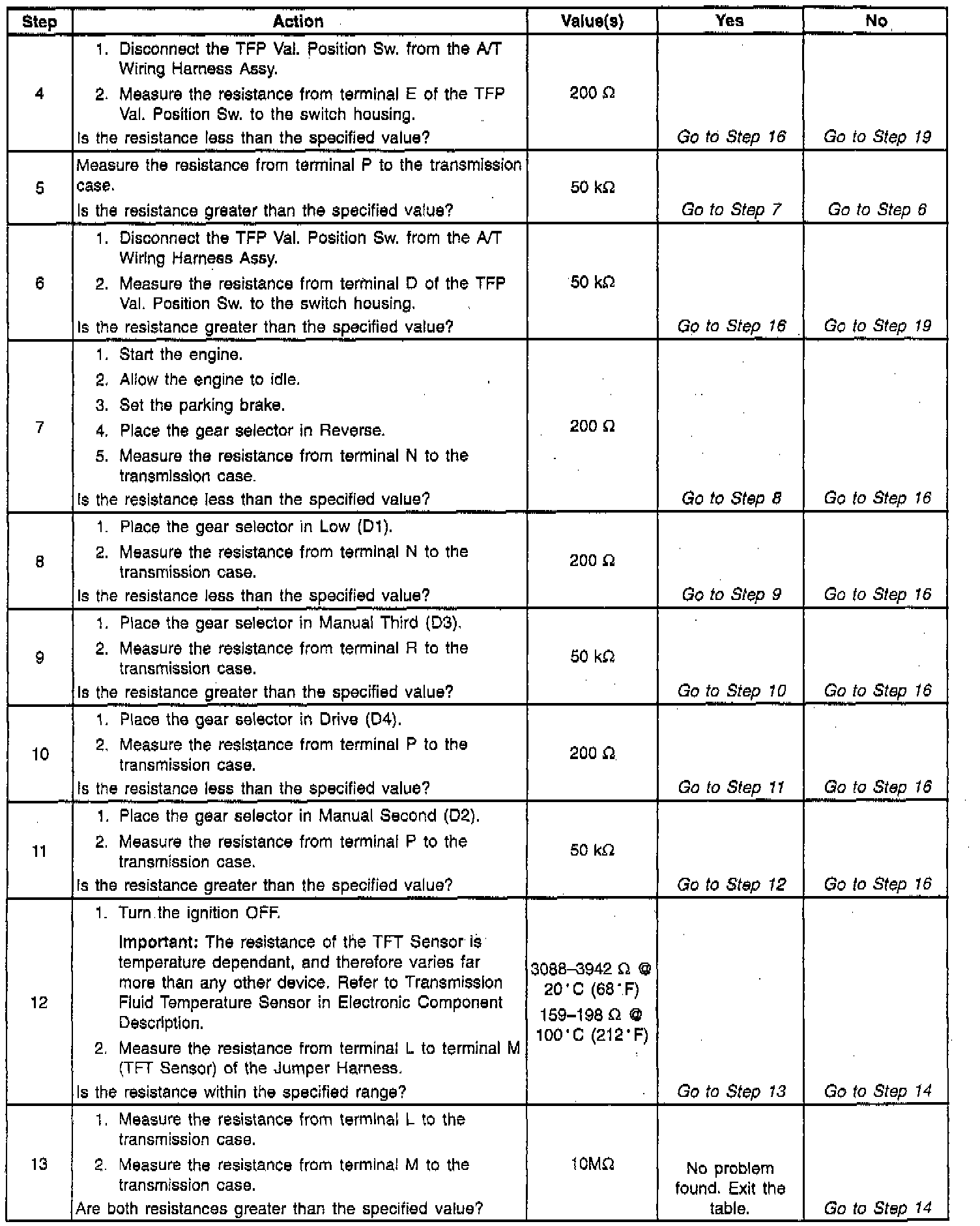 Important: This procedure tests the Automatic Transmission Fluid Pressure Manual Valve Position Switch (TFP Val. Position Sw.) circuits and the Automatic Transmission Fluid Temperature (TFT) Sensor circuit. Do not use this procedure to test other Automatic Transmission circuits, refer to 4L60-E Automatic Transmission Internal Wiring Harness check. Wiring Harness Check