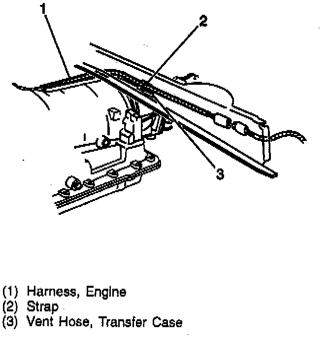 2. Vent hose from the frame rail, engine harness, and transfer case.