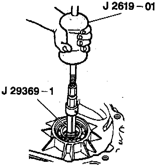 4. Output shaft bearing from the front cover using J 2619-01 and J 29369-1.