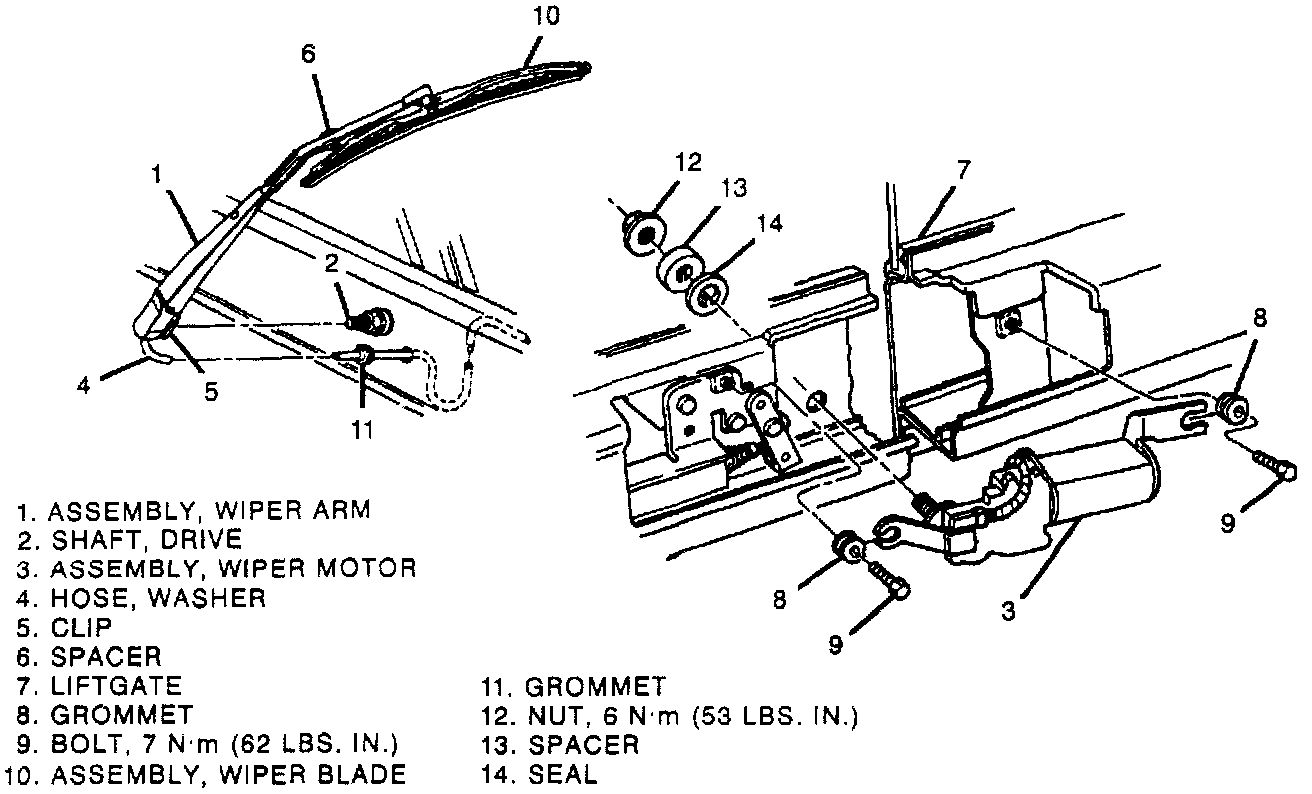 ^ Before removing the wiper arm and blade assembly, use a suitable marker on the liftgate to indicate proper park position and to aid in reinstallation.