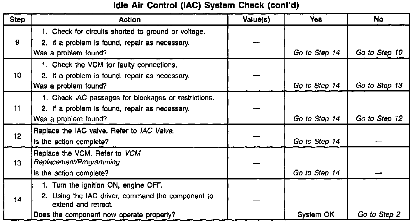 ^ If intermittent poor driveability or idle symptoms are resolved by disconnecting the IAC, carefully recheck connections, valve terminal resistance or replace IAC.