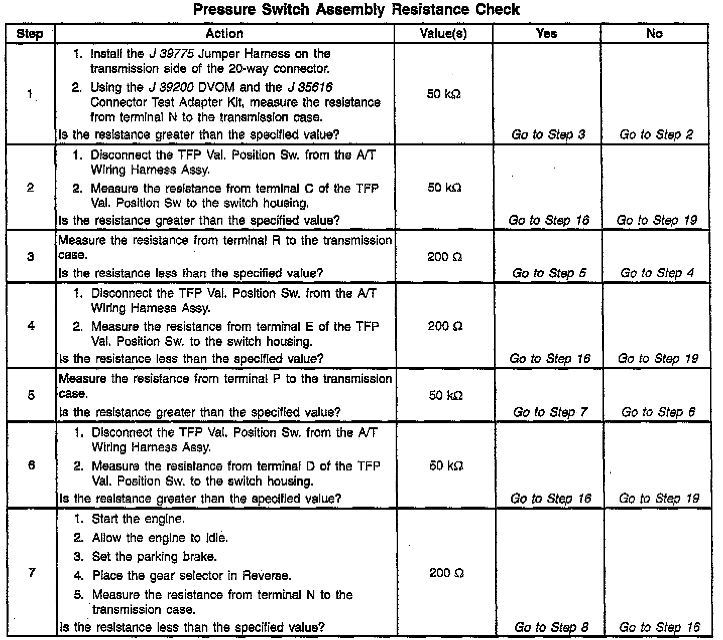 Important: This procedure tests the Automatic Transmission Fluid Pressure Manual Valve Position Switch (TFP Val. Position Sw.) circuits and the Automatic Transmission Fluid Temperature (TFT) Sensor circuit. Do not use this procedure to test other Automatic Transmission circuits, refer to 4L60-E Automatic Transmission Internal Wiring Harness Check.Testing and Inspection