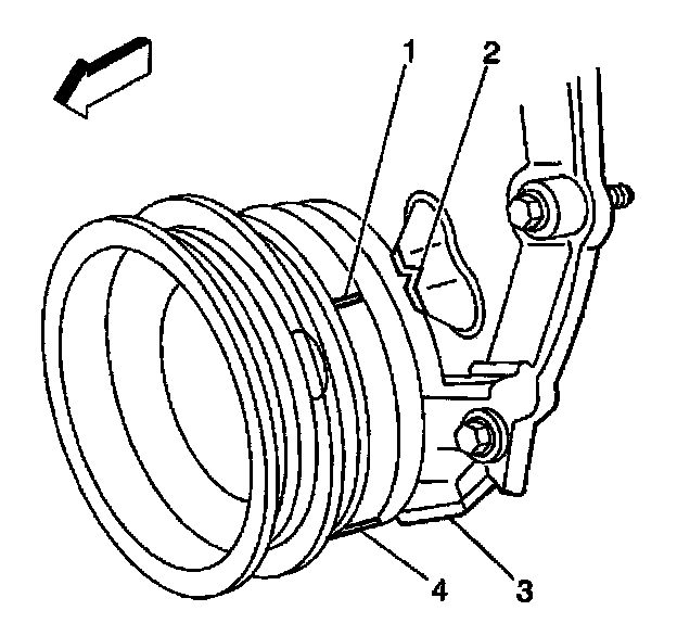 Important: The engine front cover has 2 alignment tabs and the crankshaft balancer has 2 alignment marks (spaced 90 degrees apart) which are used for positioning number 1 piston at top dead center (TDC). With the piston on the compression stroke and at top dead center, the crankshaft balancer alignment mark (1) must align with the engine front cover tab (2) and the crankshaft balancer alignment mark (4) must align with the engine front cover tab (3).