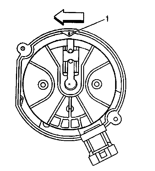 9. Once the distributor is fully seated, align the distributor rotor segment with the number 6 pointer (1) that is cast into the distributor base. If the distributor rotor segment does not come within a few degrees of the number 6 pointer (1), the gear mesh between the distributor and camshaft may be off a tooth or more. Repeat the procedure again in order to achieve proper alignment.