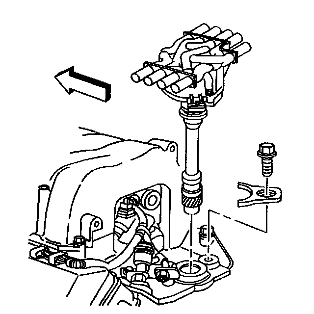 8. Install the distributor hold down clamp bolt to the lower intake manifold. Tighten the distributor clamp bolt to 27 Nm (20 ft. lbs.).