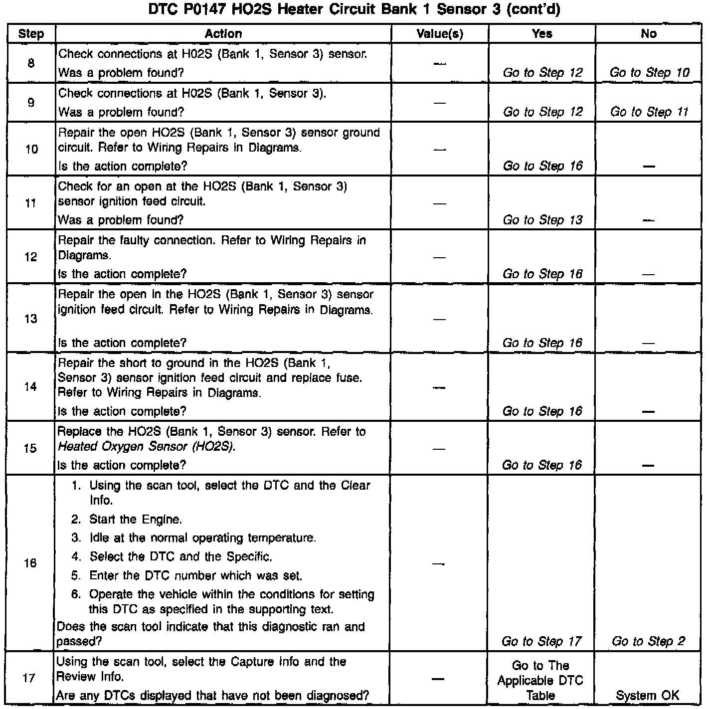 The HO2S heater provides for faster sensor warm-up which allows the sensor to become active in a shorter period of time. The sensor will remain active during a long extended idle. The DTC P0147 determines if the HO2S heater is functioning properly by monitoring the amount of time necessary for the HO2S to become active after start-up This DTC is a type B DTC.