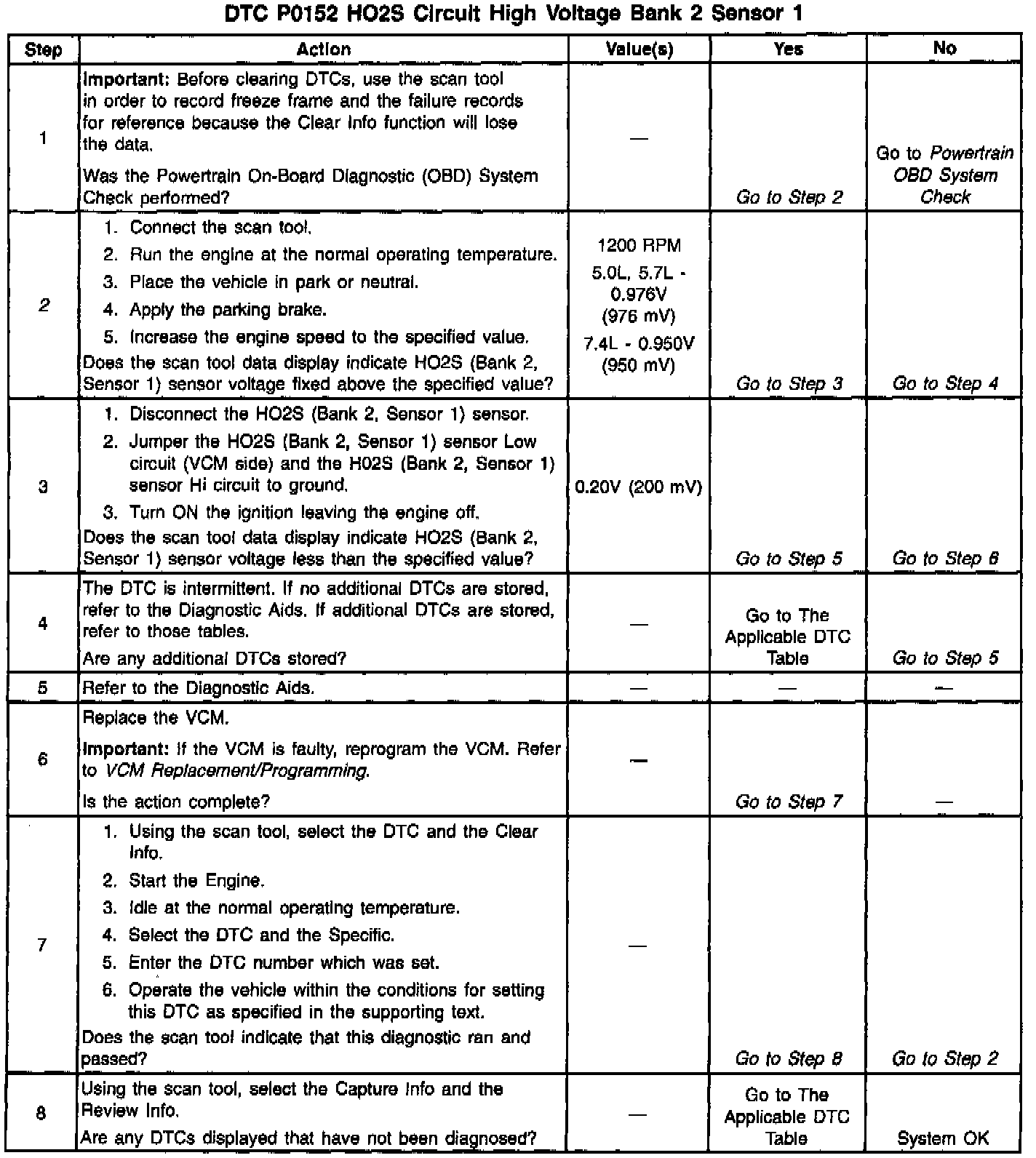 The Sensor is like an open circuit and produces no voltage when it is below 360°C (600°F). The Diagnostic Trouble Code (DTC) P0151, P0152 or an open sensor circuit or the cold sensor causes the Open Loop operation. The DTC P0152 determines if the HO2S sensor or the circuit is shorted to high by checking for a rich condition during a steady throttle. The DTC P0152 is a type A DTC.