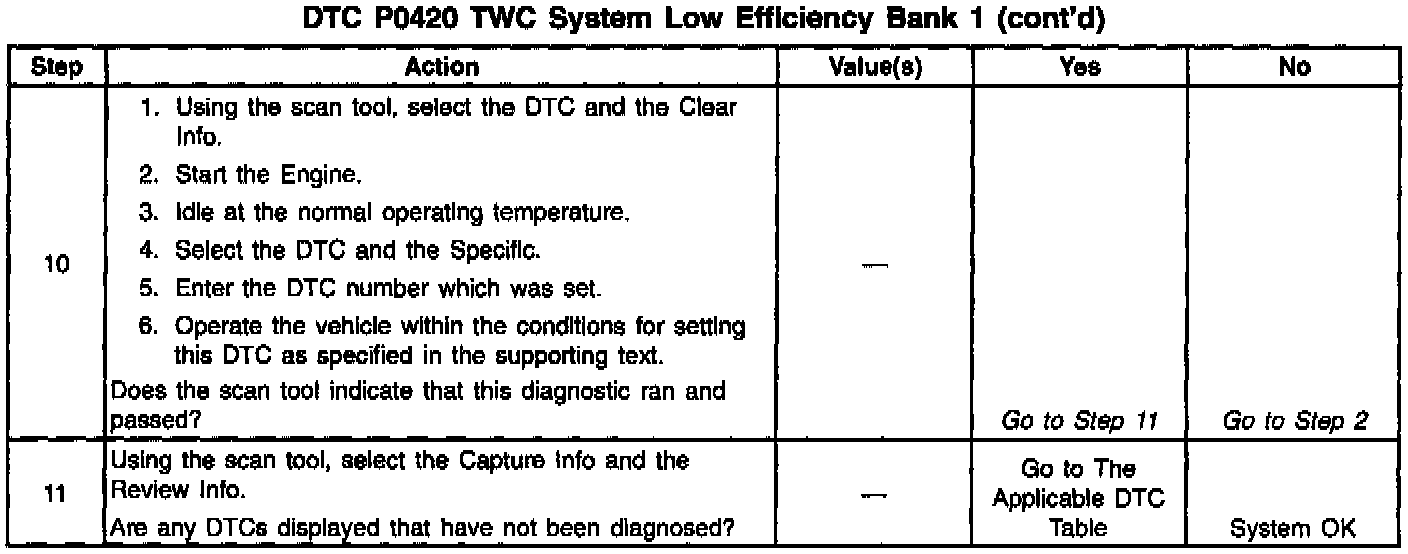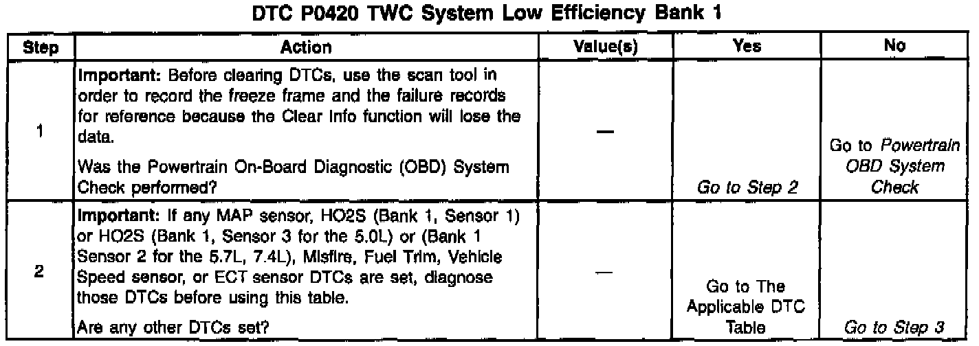 In order to control emissions of Hydrocarbons (HC), Carbon Monoxide (CO), and Oxides of Nitrogen (NOx). The system uses a three-way catalytic converter. The catalyst within the converter promotes a chemical reaction which oxidizes the HC and CO present in the exhaust gas, converting them into harmless water vapor and carbon dioxide. The catalyst also reduces NOx, converting it to nitrogen. The VCM has the capability to monitor this process using the HO2S (Bank 1, Sensor 1). The HO2S (Bank 1, Sensor 2), located in the exhaust stream past the three-way catalytic converter, produces an output signal which indicates the oxygen storage capacity of the catalyst; this in turn indicates the catalyst's ability to convert exhaust emissions effectively. If the catalyst is functioning correctly, the HO2S (Bank 1, Sensor 2) signal will be far less active than that produced by the HO2S (Bank 1, Sensor 1). If a problem exists which causes the VCM to detect an excessive HO2S (Bank 1, Sensor 2) activity outside of an acceptable range for an extended period of time, the VCM sets the DTC P0420. This DTC indicates that the three-way catalytic converter's oxygen storage capacity is below a threshold considered acceptable. This is a type A DTC.