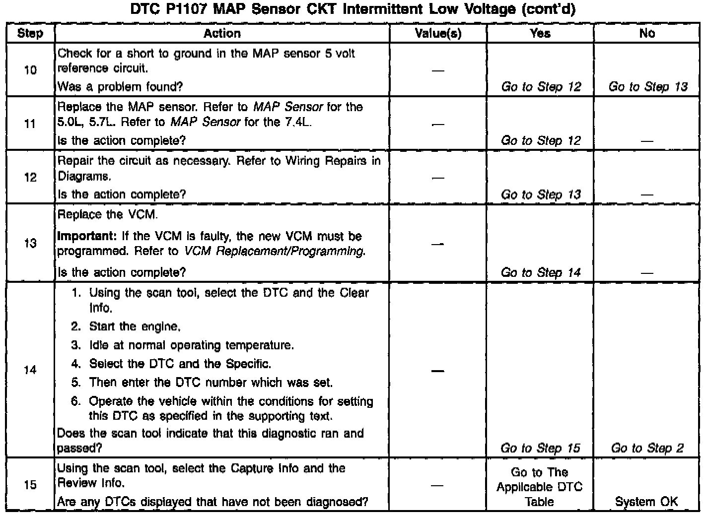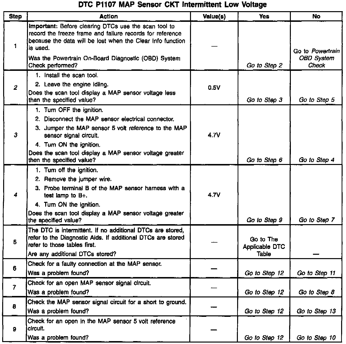 An intermittent open in the MAP sensor signal circuit or the 5 volt reference circuit will result in a DTC P1107. With the ignition ON and the engine off, the manifold pressure is equal to the atmospheric pressure with the signal voltage high. The VCM uses this information as an indication of the altitude of the vehicle. Comparison of this reading with a known good vehicle using the same sensor is a good way to check the accuracy of a suspect sensor. Readings should be the same ±0.4 volt. Refer to Intermittents. - Intermittent Malfunctions