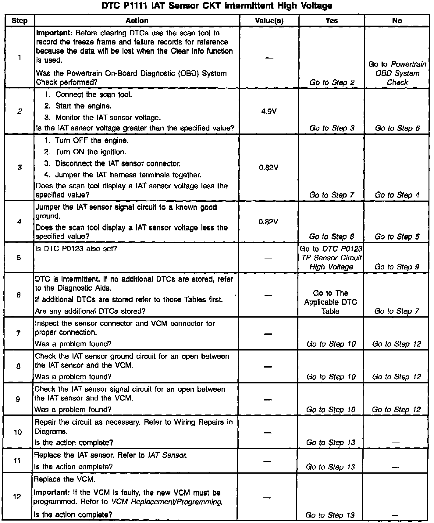 A scan tool indicates the temperature of the ambient air entering the throttle body. The air temperature should read very close to the temperature of the outside air. The air temperature should rise gradually as the engine warms up and the underhood temperature increases. If the DTC P1111 is set, the problem is intermittent. Check for poor connections at the VCM and IAT sensor by wiggling the connector gently and monitoring the IAT temperature or IAT voltage on the scan tool. If the voltage waivers, repair the connector that caused the waiver. Also, a sensor may become skewed or mis-scaled. The Temperature vs. Resistance Value Table will help to detect a skewed sensor. Refer to Temperature vs Resistance. Specifications
