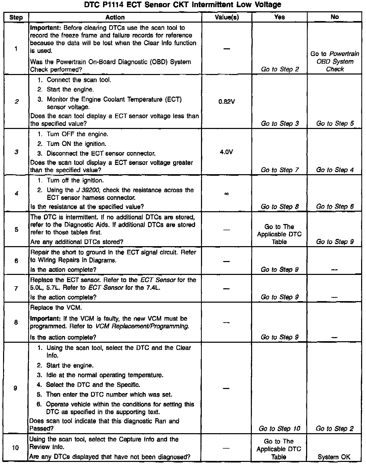 3. This test simulates a DTC P0118. If the VCM recognizes the high signal voltage (high temperature), and the scan tool reads 4.9 volts or above, the VCM and wiring are OK.