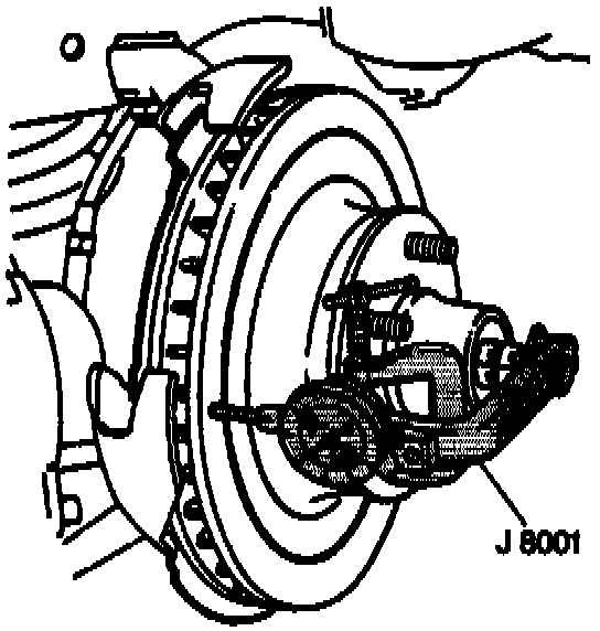 NOTE: In some cases, excessive lateral runout can be improved by indexing the rotor on the hub one or two bolt positions from the original position. If lateral runout cannot be corrected by indexing the rotor, check the hub and bearing assembly for excessive lateral runout or looseness. If the hub and bearing assembly lateral runout exceeds 0.040 mm (0.0015 inch), repair or replace and bearing assembly.