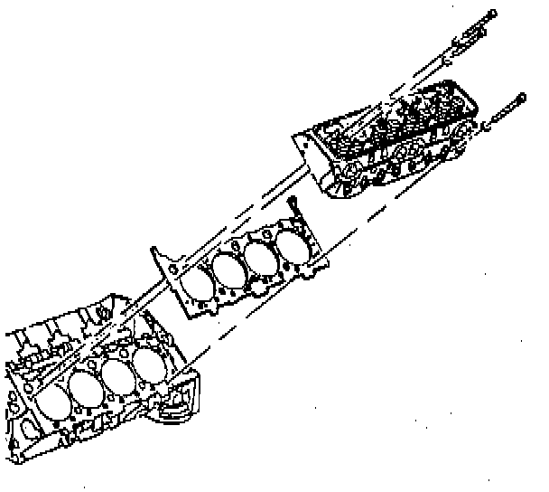 1. Install the head gasket. Do not use sealer on composite steel-asbestos gaskets. Place the gasket over the block dowel pins with the bead up.