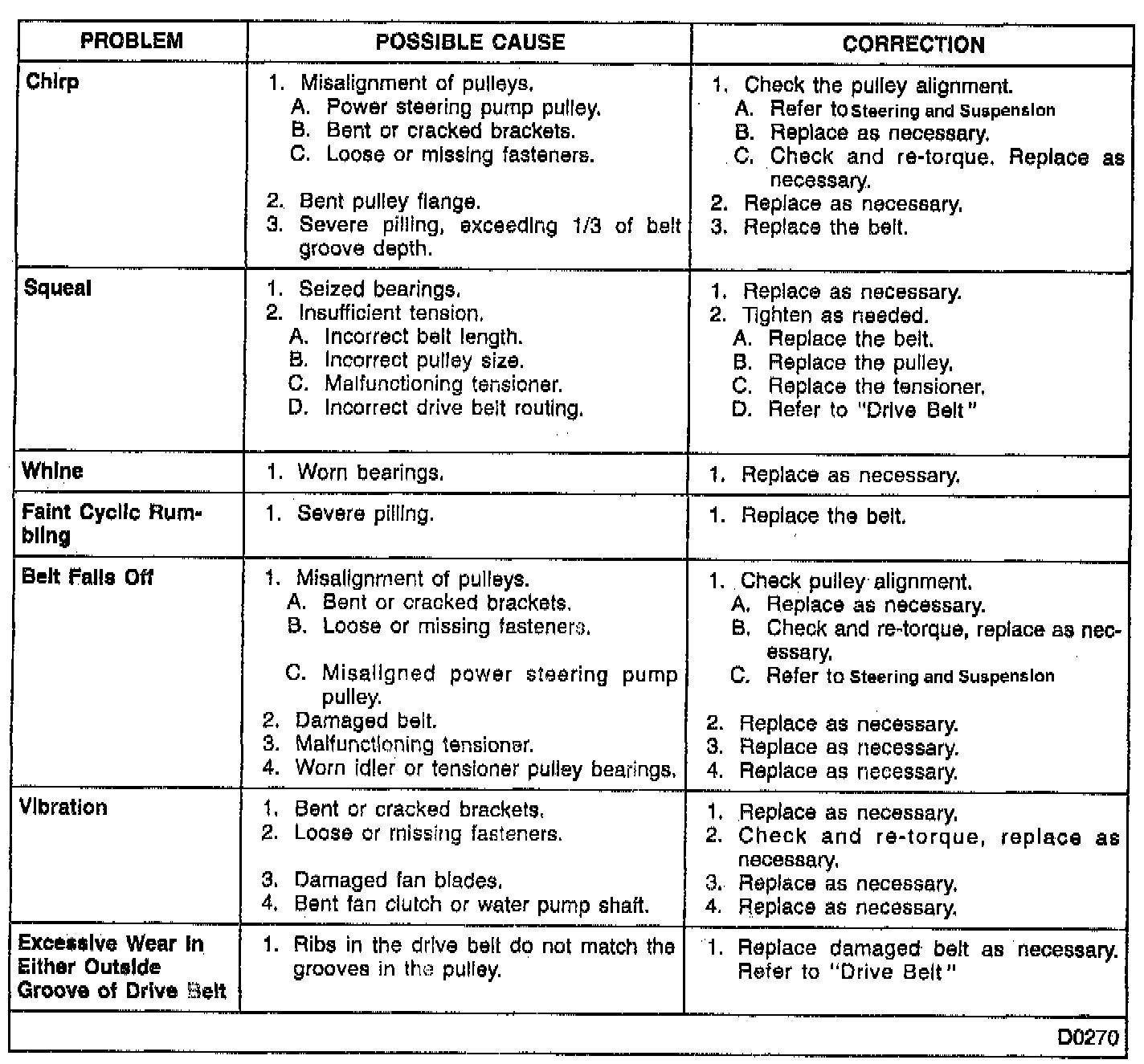 Drive belts and pulleys wear evenly with use. Unusual signs of wear indicate some correction is needed. This diagnostic chart will aid in diagnosing multiple ribbed belt system problems.