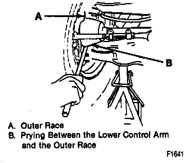 - Pry between the lower control arm and the outer race while reading the dial indicator. This will show vertical looseness in the ball joints.