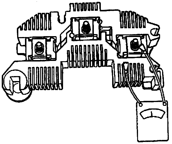 To test the rectifier bridge, connect an ohmmeter to the grounded heat sink and one of the three terminals, while pressing down firmly on the flat metal clip. Observe the ohmmeter reading and reverse the lead connectors to the grounded heat sink and the same metal clip. It both readings are the same, replace the rectifier bridge. A good rectifier bridge will give one high and one low reading. Repeat this procedure between the grounded heat sink and the other two terminals, and between the insulated heat sink and each of the three terminals. This makes a total of six tests, with two readings taken for each test.