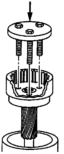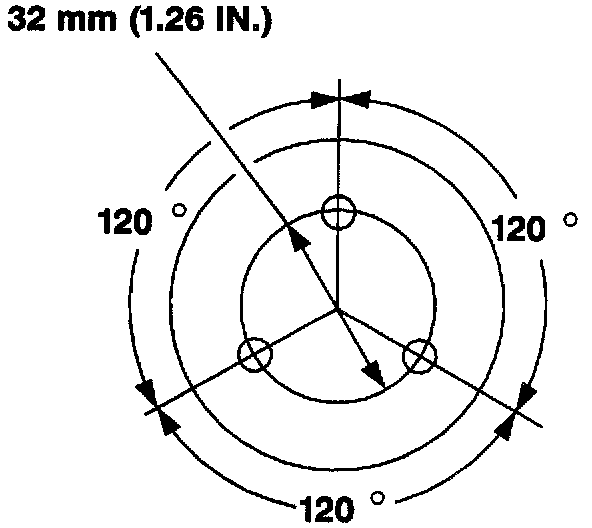 - Center support bearing (32) from the driveshaft (31) using a locally fabricated tool as shown in Figures 11 through 13. With the driveshaft in a suitable support fixture, place the tool bolt ends through the access holes in the wide end of the driveshaft. Squarely press the bearing off of the surface on the center shaft.