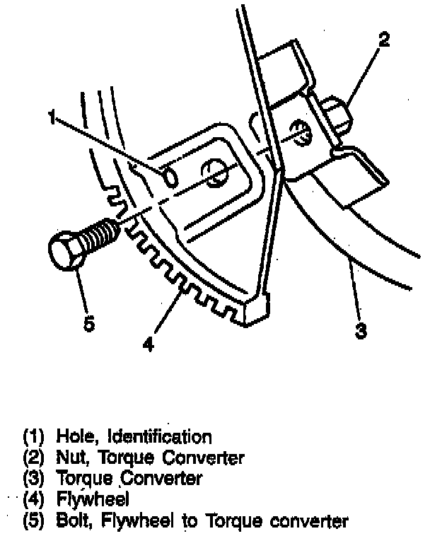 - Ensure the identification hole on the flywheel is aligned with the attachment on the torque converter.