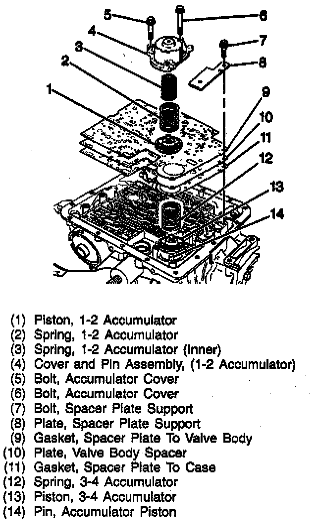 5. Accumulator cover bolts and the 1-2 accumulator cover and the pin assembly.