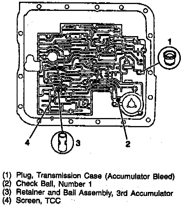 4. Solenoid bolts, TCC solenoid assembly with the O-ring seal, and the wiring harness.