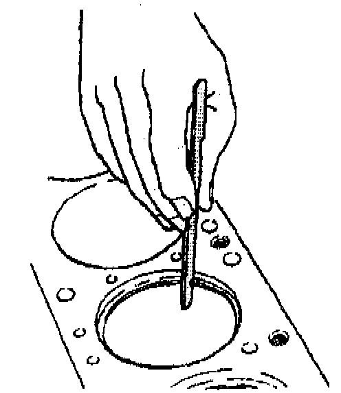 b. Slip the outer surface of the second compression ring into the respective piston ring groove in order to make sure the ring does not bind. If the ring groove causes binding, dress the groove with a fine cut file. Replace distorted rings.