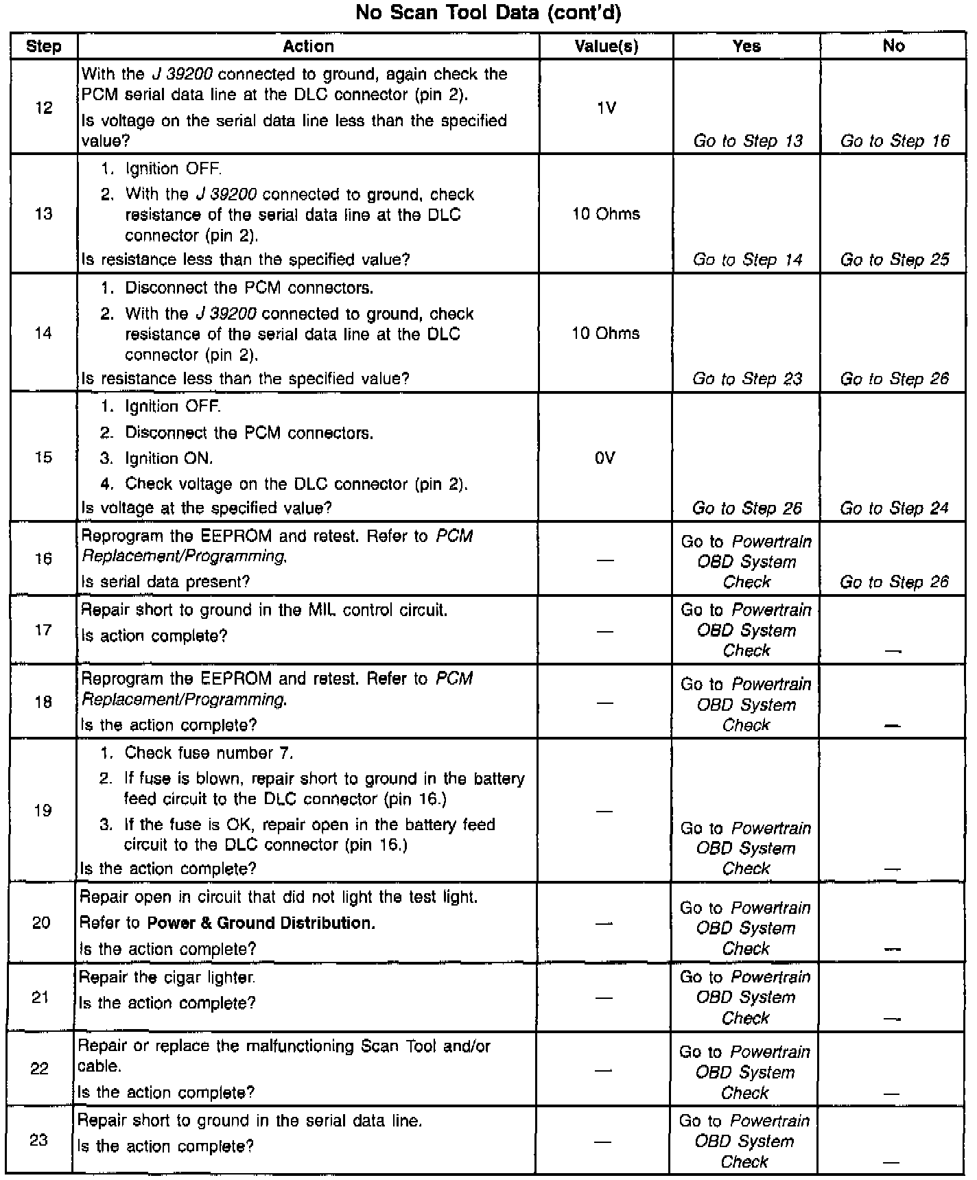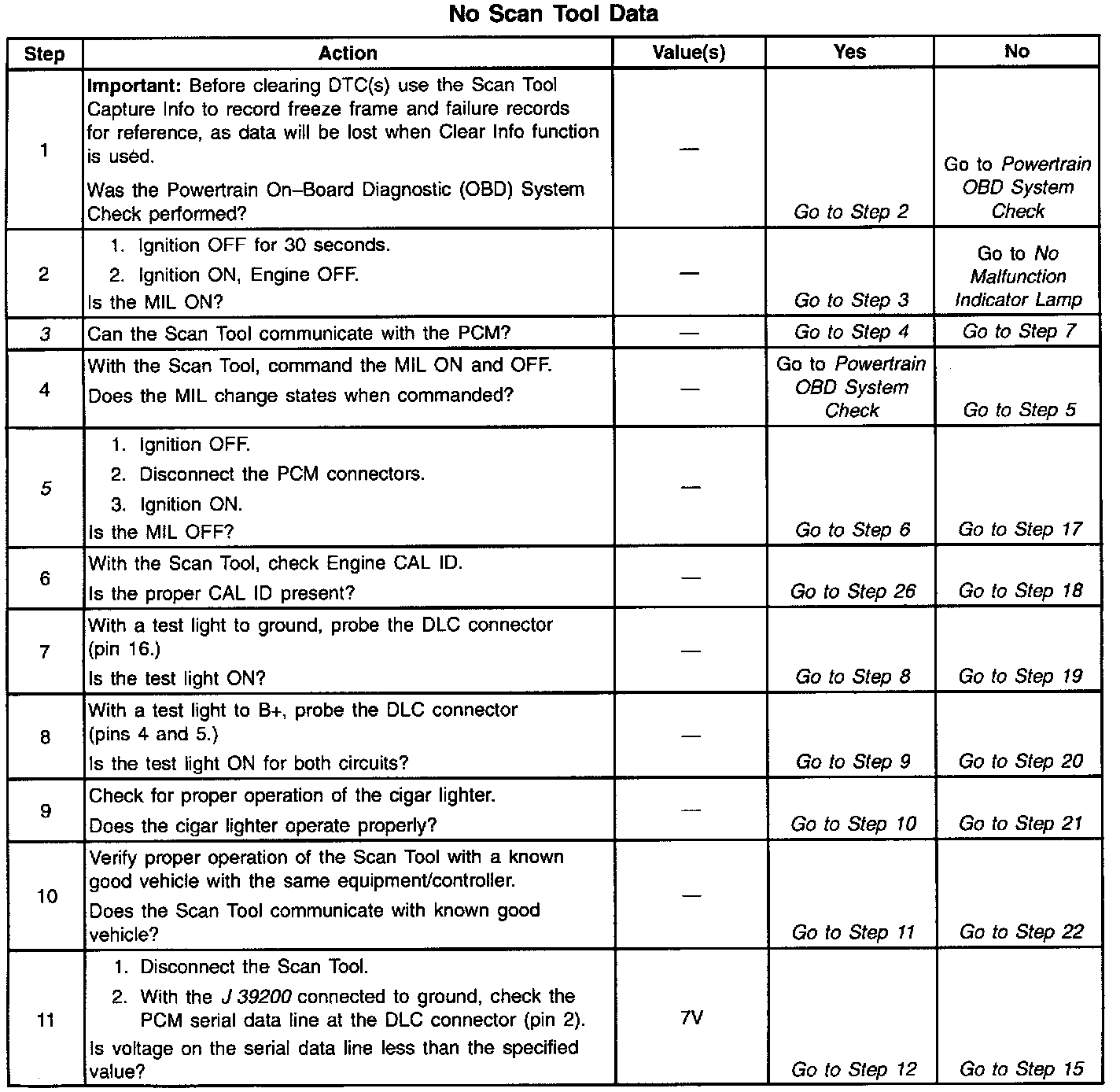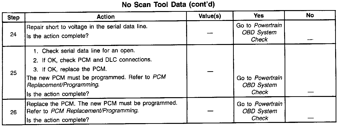 3. Check that the Scan Tool is functioning properly on another vehicle. If the scan is functioning properly, and CKT the serial data circuit is OK, the PCM may be at fault for the NO DLC symptom.