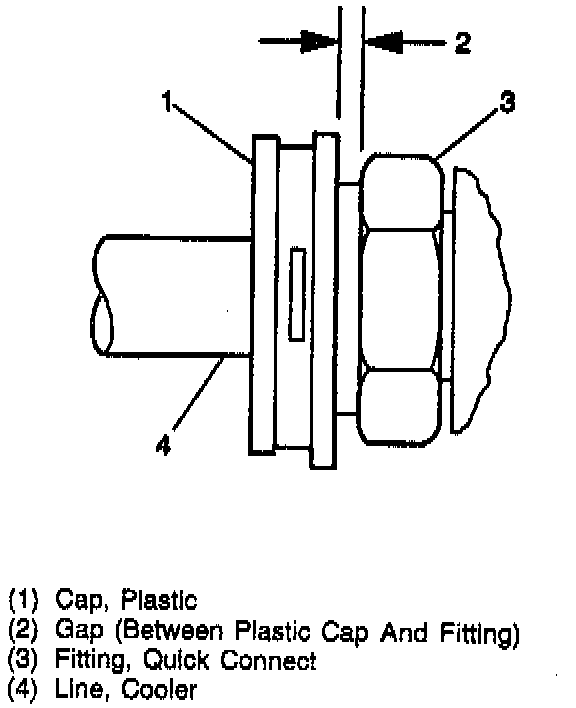 - Pull back sharply on the cooler line to assure the line is fastened into the connector. If the plastic cap is not properly seated, remove the existing retaining clip and install a "NEW" retaining clip per step 2 of the installation procedure.
