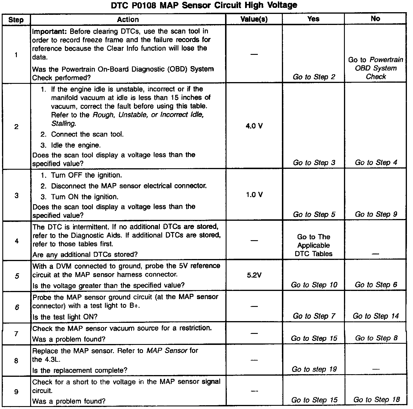 The Manifold Absolute Pressure (MAP) sensor responds to changes in intake manifold pressure (vacuum). A 5 volt reference is applied to the sensor on the 5 volt reference circuit. A variable resistor moves in relation to the manifold pressure and a voltage signal is sent back to the VCM on the MAP signal circuit, This voltage signal varies from 1.0-1.5 volts at closed throttle to 4.0-4.6 volts at wide open throttle (low vacuum). The VCM utilizes the MAP signal and throttle position in order to determine the correct amount of fuel delivered to the engine. This DTC is a type A DTC.