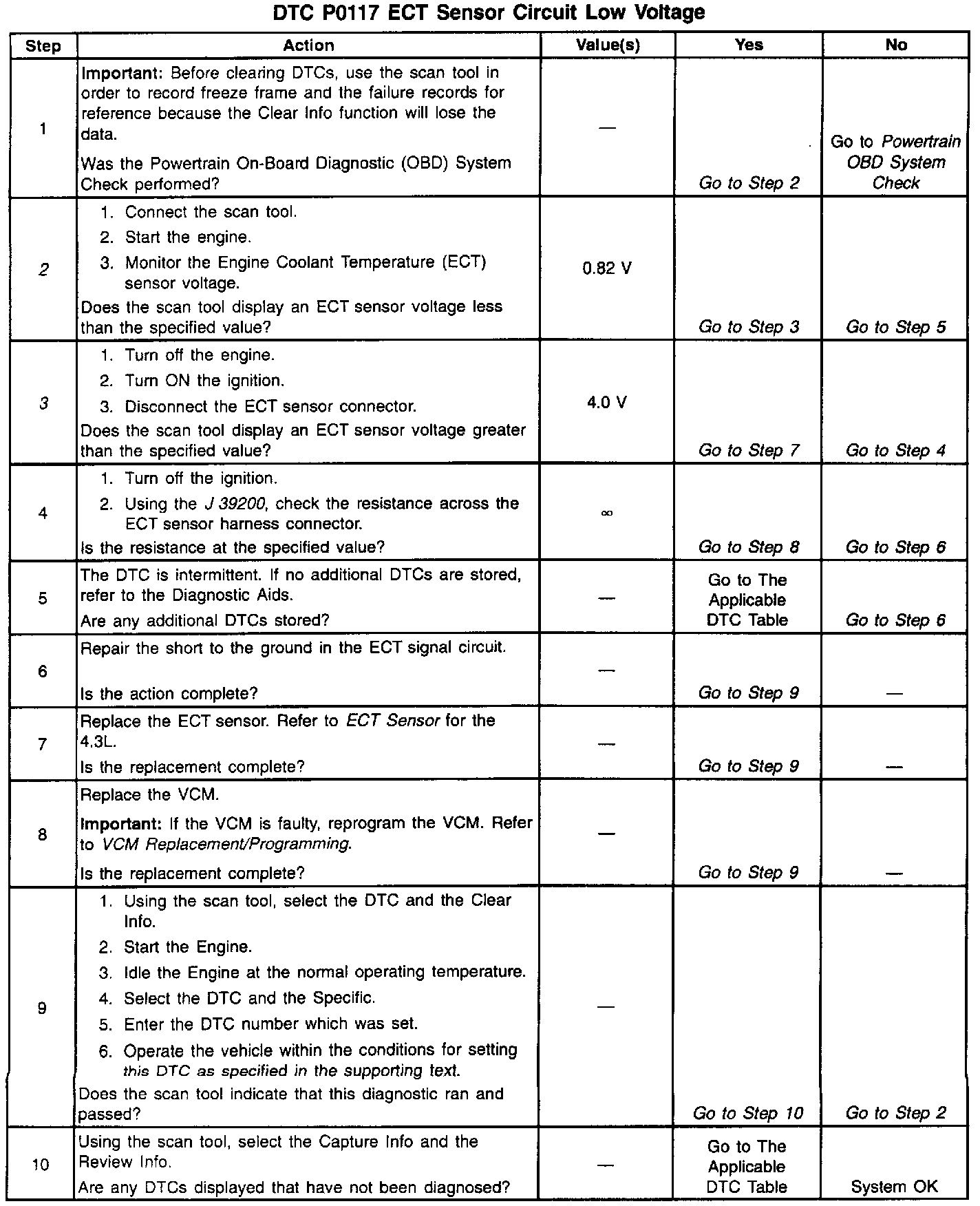 Use the Temperature vs. Resistance Value Table to test the coolant sensor at various temperature levels in order to evaluate the possibility of a skewed (mis-scaled) sensor. A skewed sensor could result in poor driveability complaints. Refer to Temperature vs Resistance. Specifications