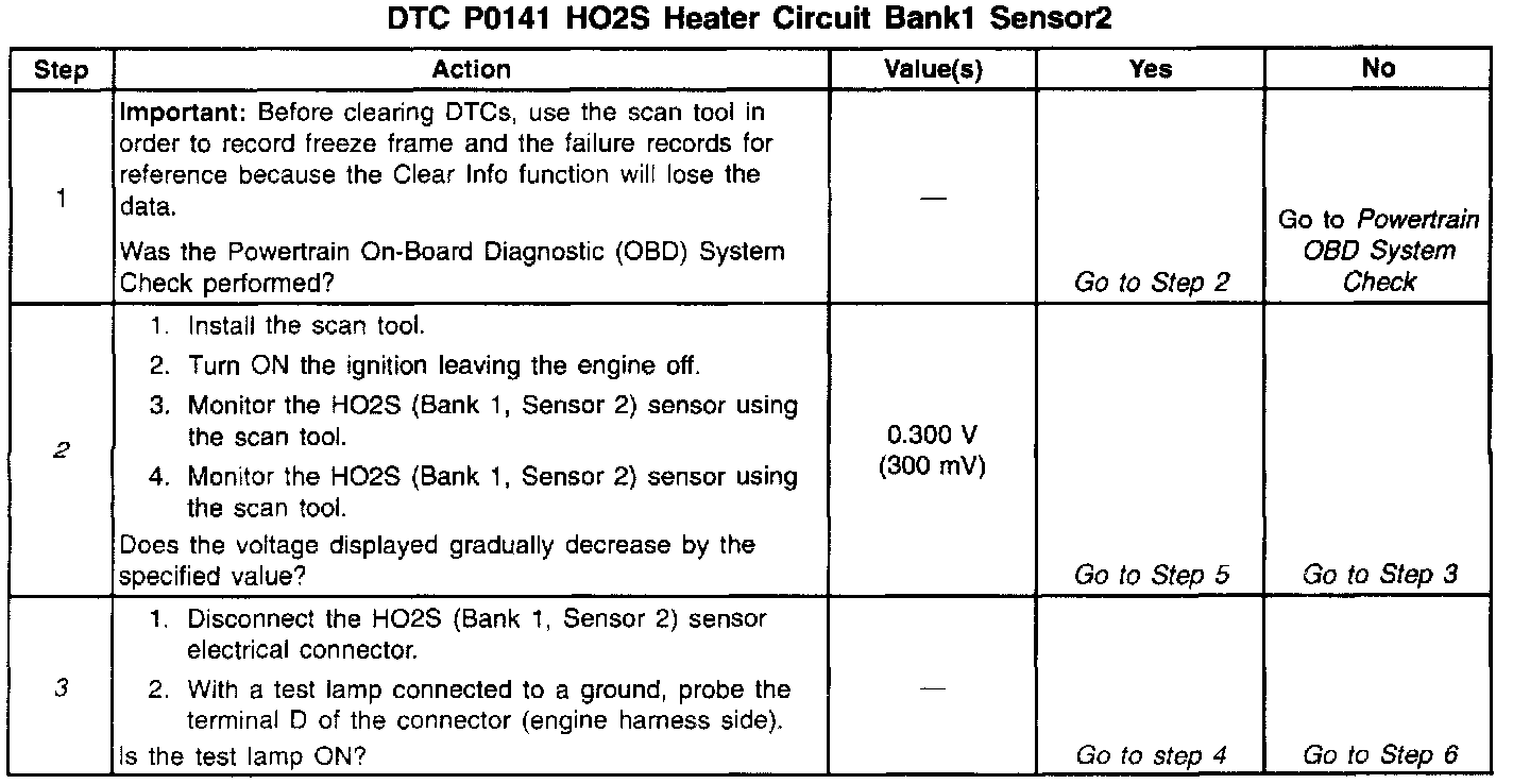 2. This step determines if the DTC P0141 is the result of a hard failure or an intermittent condition. With the ignition switch ON leaving the engine off, the HO2S (Bank 1, Sensor 2) voltage displayed on the scan tool should gradually change to 0.300 volt. This indicates that the heater is working properly. The HO2S voltage can rise as high as 975 mV (0.975 volts) before it toggles back down. The main thing to look for is a change.