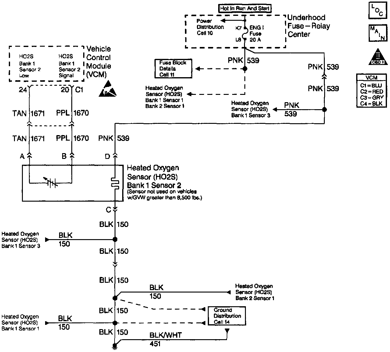The VCM supplies a voltage of approximately 0.45 volt (450 mV) between the HO2S High and the HO2S Low circuits.