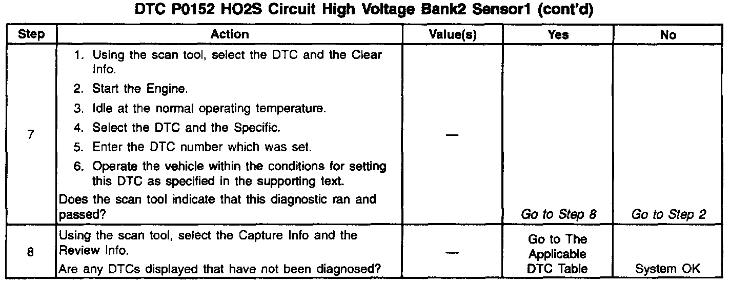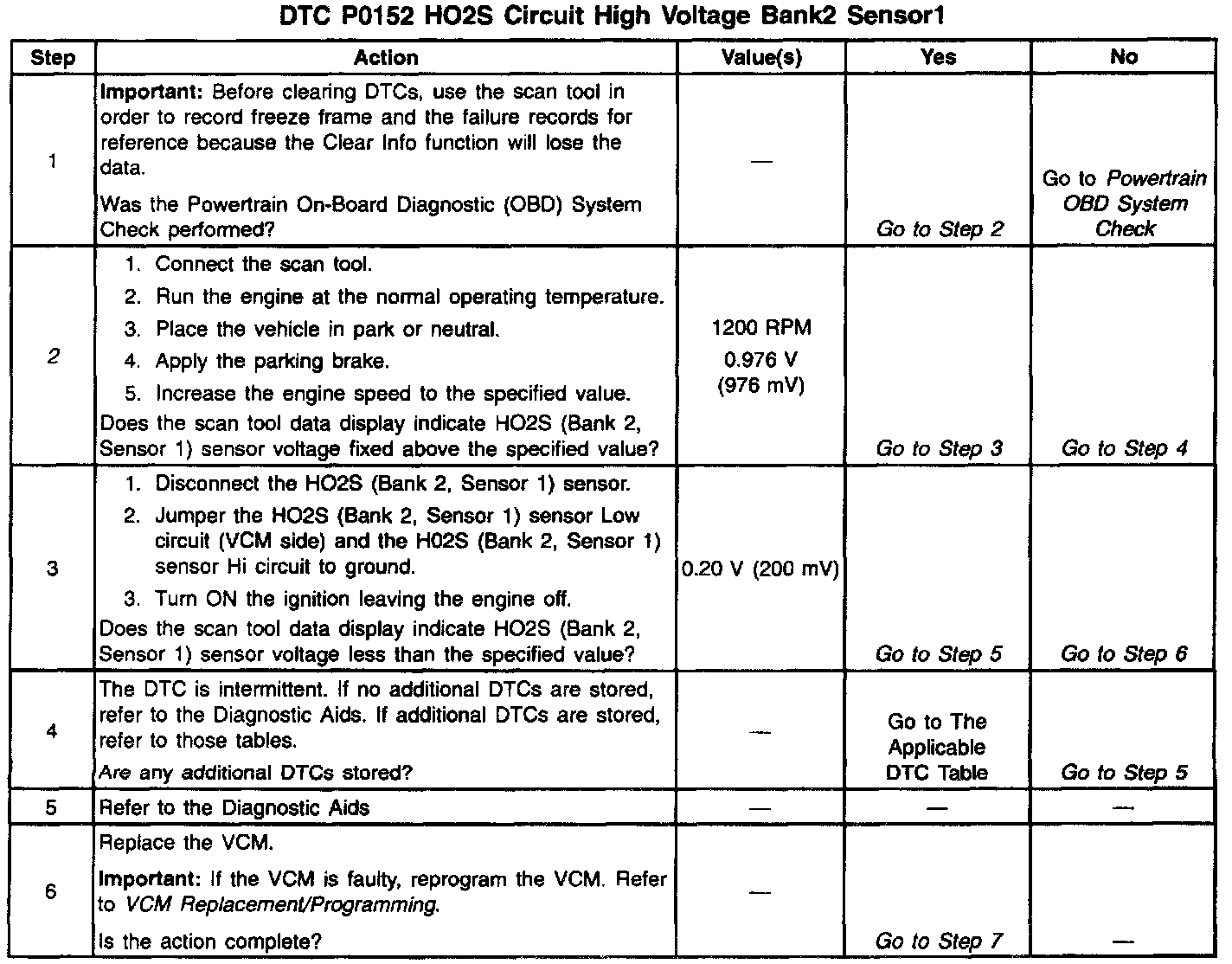 The Sensor is like an open circuit and produces no voltage when it is below 360°C (600°F). The DTC P0151, P0152 or an open sensor circuit or the cold sensor causes the Open Loop operation. The DTC P0152 determines if the HO2S sensor or the circuit is shorted to high by checking for a rich condition during a steady throttle. The DTC P0152 is a type A DTC.