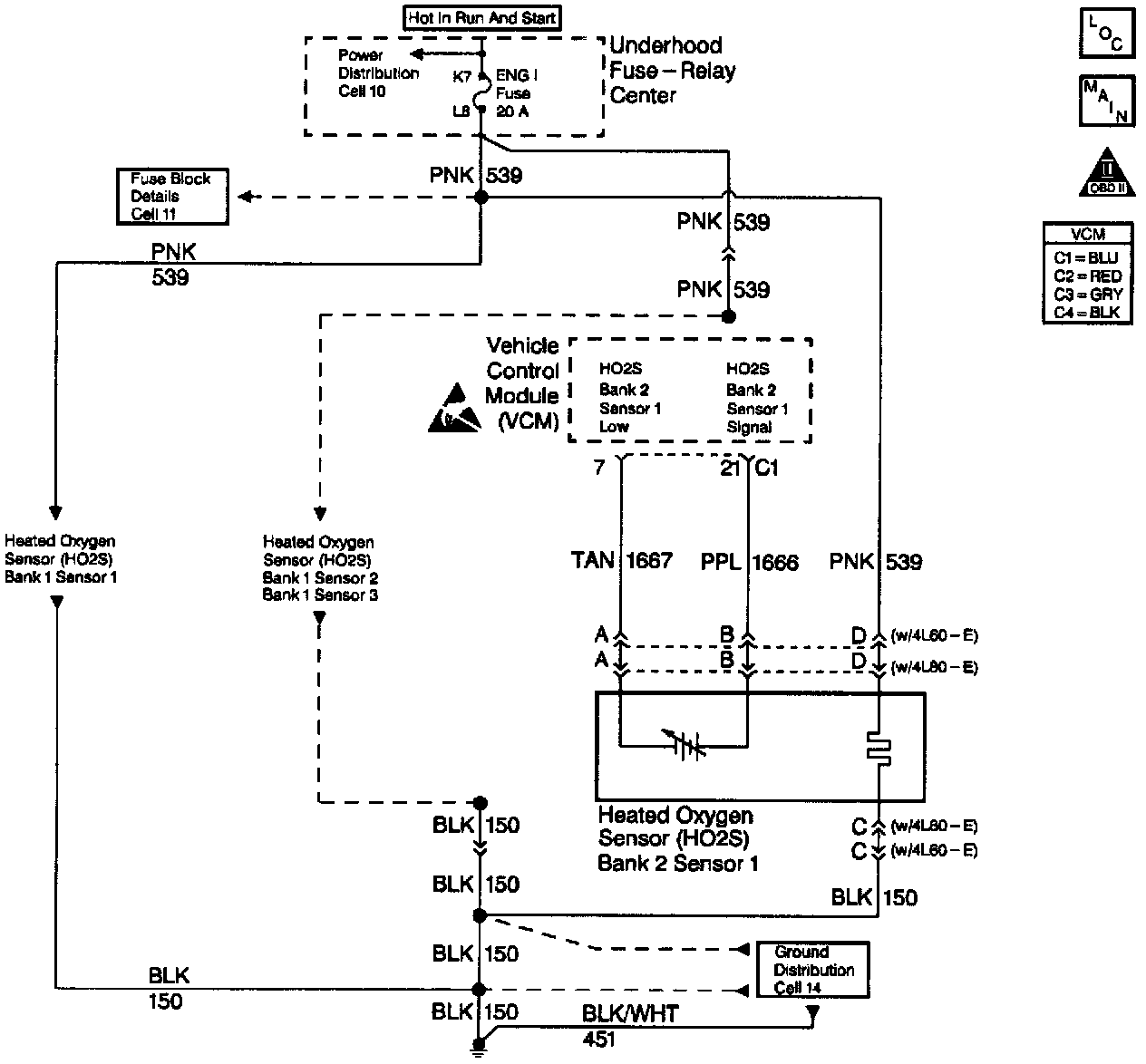 The VCM supplies a voltage of about 0.45 volt (450 mV) between the HO2S High and HO2S Low circuits. (If measured with a megohm digital voltmeter, this may read as low as 0.32 volt.) The Heated Oxygen Sensor (HO2S Bank 2 Sensor 1) varies the voltage within the range of about 1.0 volt (1000 mV) if the exhaust is rich. down to about 0.10 volt (100 mV) it the exhaust is lean.