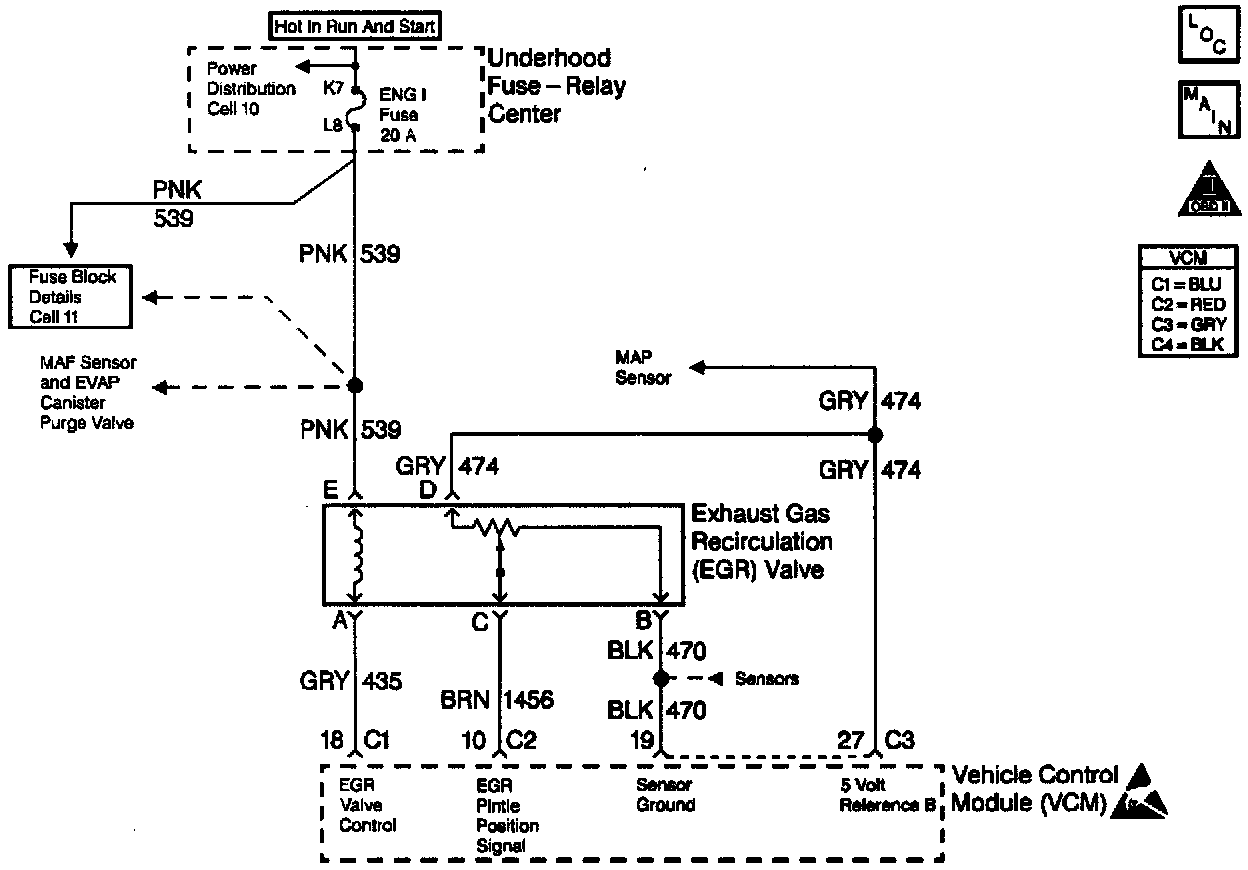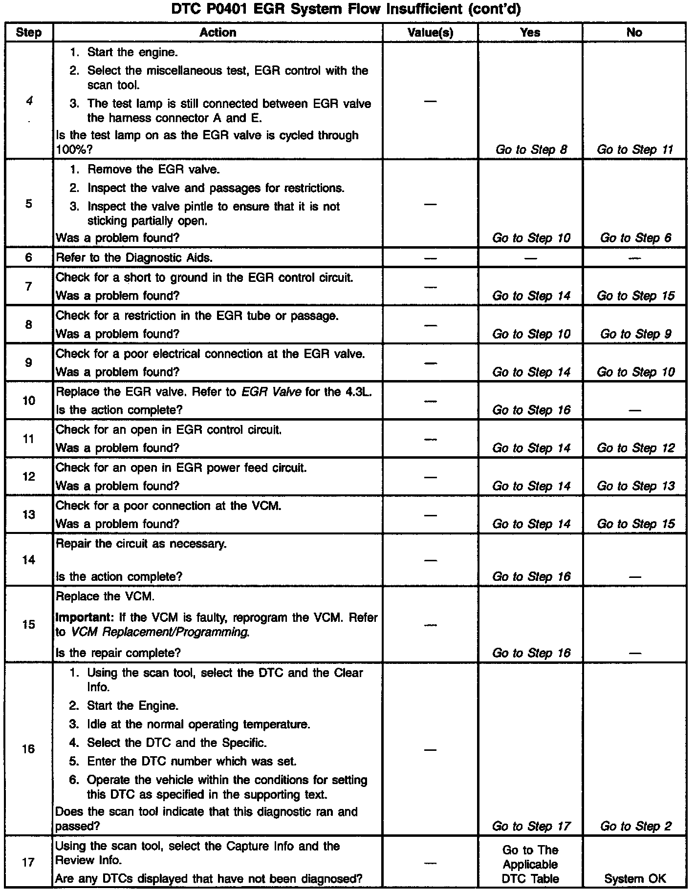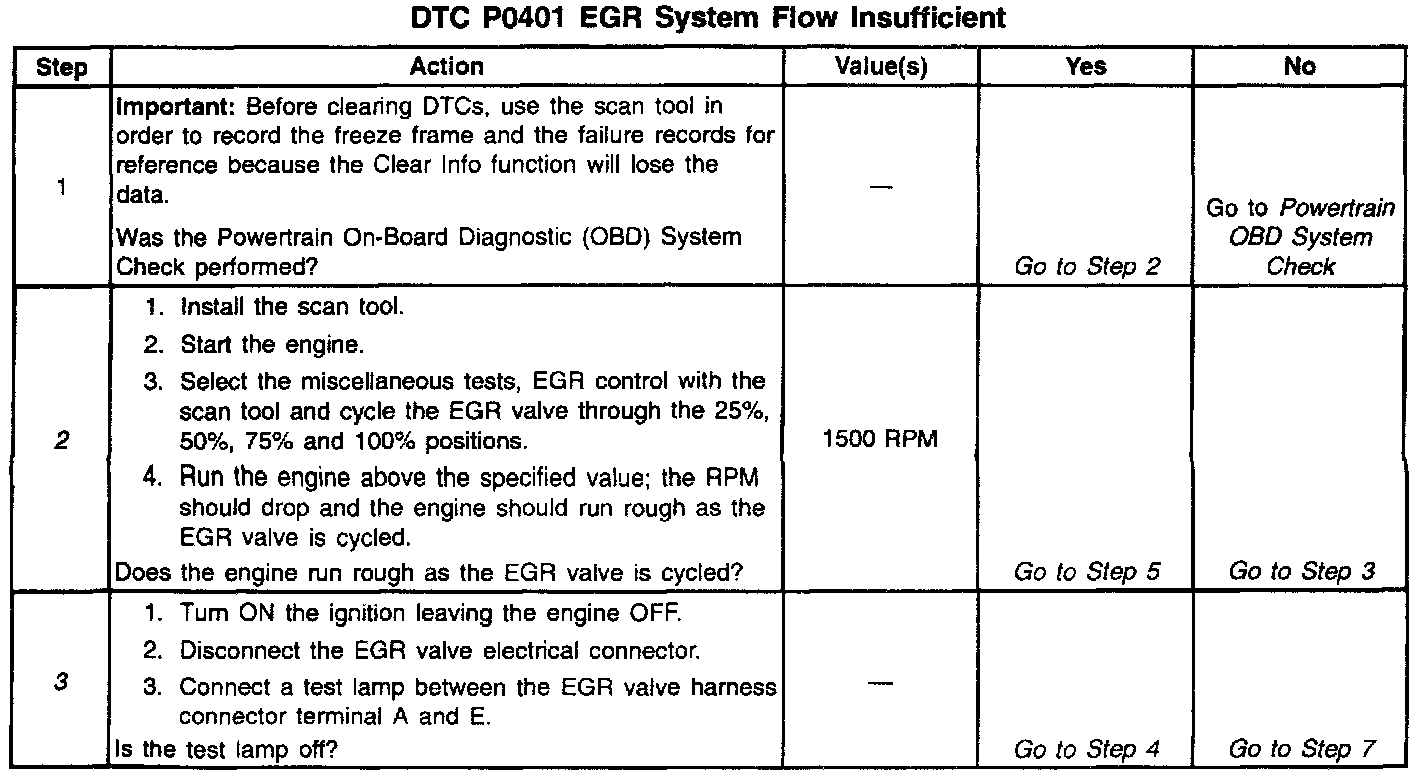 The VCM tests the exhaust gas recirculation valve by momentarily commanding the valve on while monitoring the MAR If the expected MAP increase is not seen under certain operating conditions (decel) for a calibrated number of tests, the VCM turns on the Malfunction Indicator Lamp (MIL) and the VCM stores the DTC P0401. This is a type A DTC. The VCM runs the EGR tests when the following conditions are met: