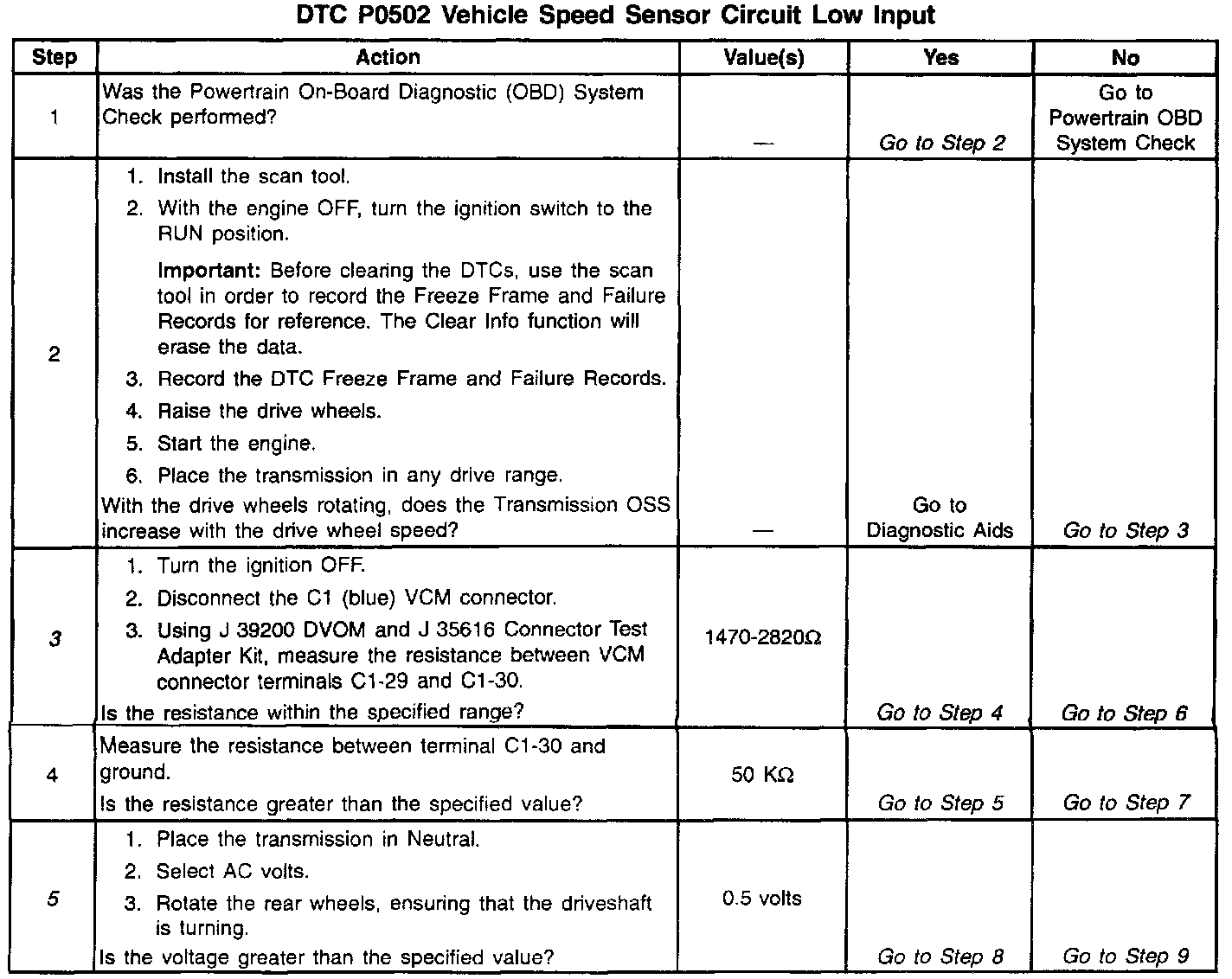 When the VCM detects a low vehicle speed when there is a high engine speed in a drive gear range, then DTC P0502 sets. DTC P0502 is a type B DTC.